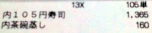 同じ日にもらったレシートから3つ. スシローで昼食をとりました.「13X 105単」で,105円の寿司を13皿食べたと分かります.なお,2行目・3行目の「内」は,「内税」の略と思われます. ローソンで,レッドブルを2本買ったら,「275 2個 550」でした.単価と…