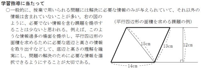 - 特に、情報を自ら選択して問題の解決に当たることが、これから望まれることを考えると、文章だけの、いわゆる文章題だけでない問題の与え方を工夫する必要がある。