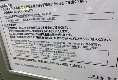 先月末に,天王寺駅で見かけたポスターの下半分です。奈良線・六地蔵駅の駅舎移転に伴い,駅間が100m変わって運賃値下げになる場合の扱いを書いています。2023/4/1から、六地蔵~山科間のJRと地下鉄の運賃が逆転します - 全国交通ニュースブログでは,六地蔵~尼崎や六地蔵~山科の運賃値下げの事例が紹介されています。