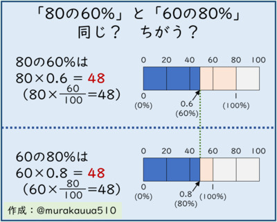 「80の60%」と「60の80%」とで,数量の構成(基準量と割合)はちがいますが,結果としての数量(比較量)は「48」と,等しくなります。