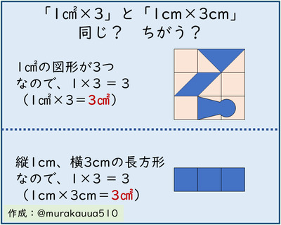 面積比較については,画像の左側に書いたとおり,「1㎠×3」は「1㎠の図形が3つ」を,「1cm×3cm」は「縦1cm,横3cmの長方形」を,連想しました。これらも,構成*1は異なるけれど結果の数量は(3㎠で)等しいと言えます。